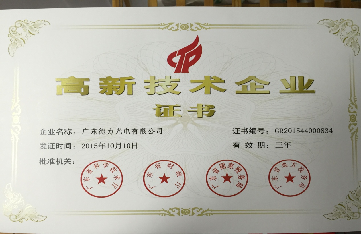 2016年3月25日德力光電收到廣東省科學(xué)技術(shù)廳、廣東省財(cái)政廳、廣東省國家稅務(wù)局、廣東省地方稅務(wù)局聯(lián)合頒發(fā)的《高新技術(shù)企業(yè)證書》。這是對德力光電科研成果及技術(shù)創(chuàng)新的認(rèn)可,是企業(yè)科技實(shí)力及持續(xù)創(chuàng)新能力的證明。